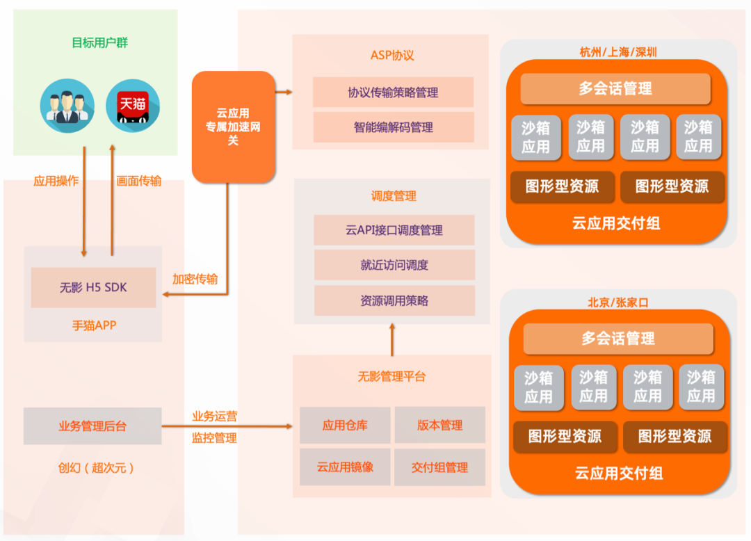 在使用侧,用户在手机天猫APP中打开一个H5页面,进入游戏世界,控制自己的人物进行实时互动,实现3D应用场景在任意终端的即点即用,不需要再下载应用内容。云应用部署的多地域交付,支持根据最终用户访问IP,智能就近调度会话,避免网络延迟对用户最终体验的影响。