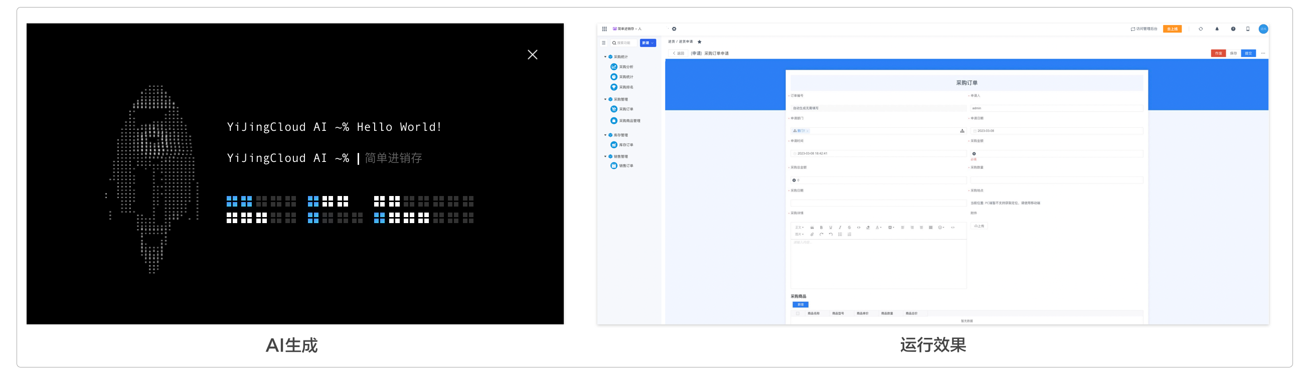 以「易鲸云」低/无代码平台为例,在测试阶段,基于AIGC模式,当用户输入想要的应用名称(比如进销存)时,平台通过用户信赖的AI产品推理出与进销存相关的内容,自动组装成一个完整应用,当不满足于AIGC生成应用的情况下,更可以通过拖拉拽的方式来满足用户的个性化需求并持续迭代。